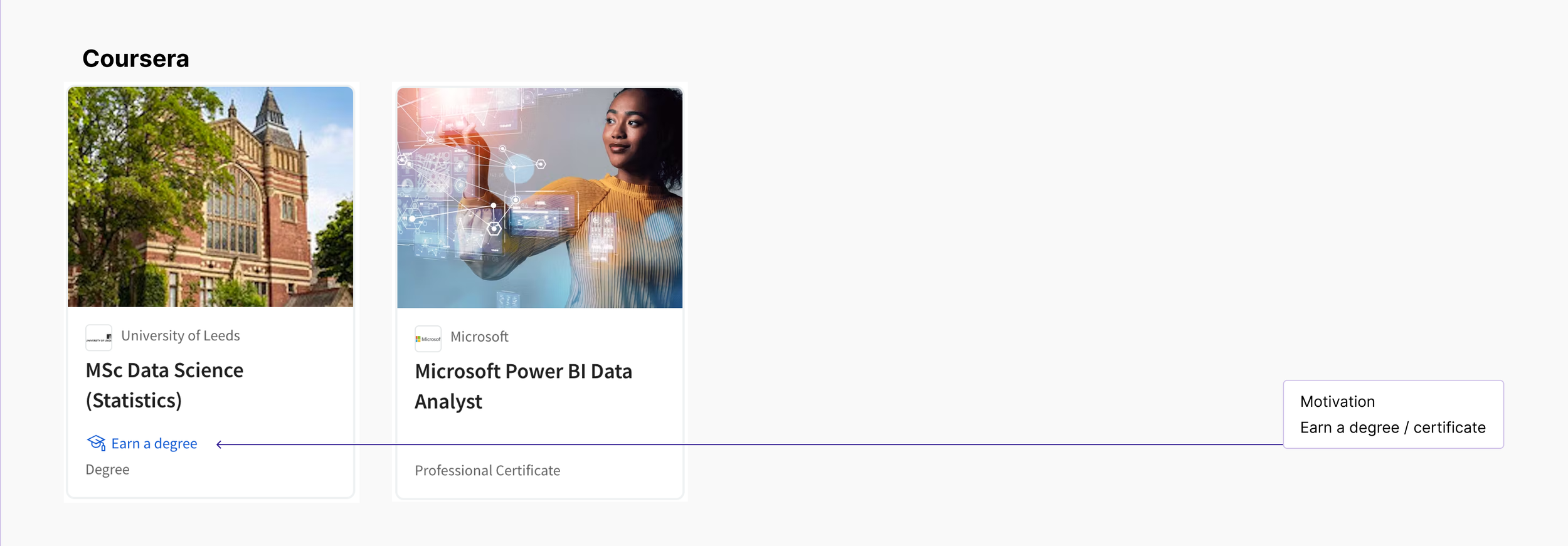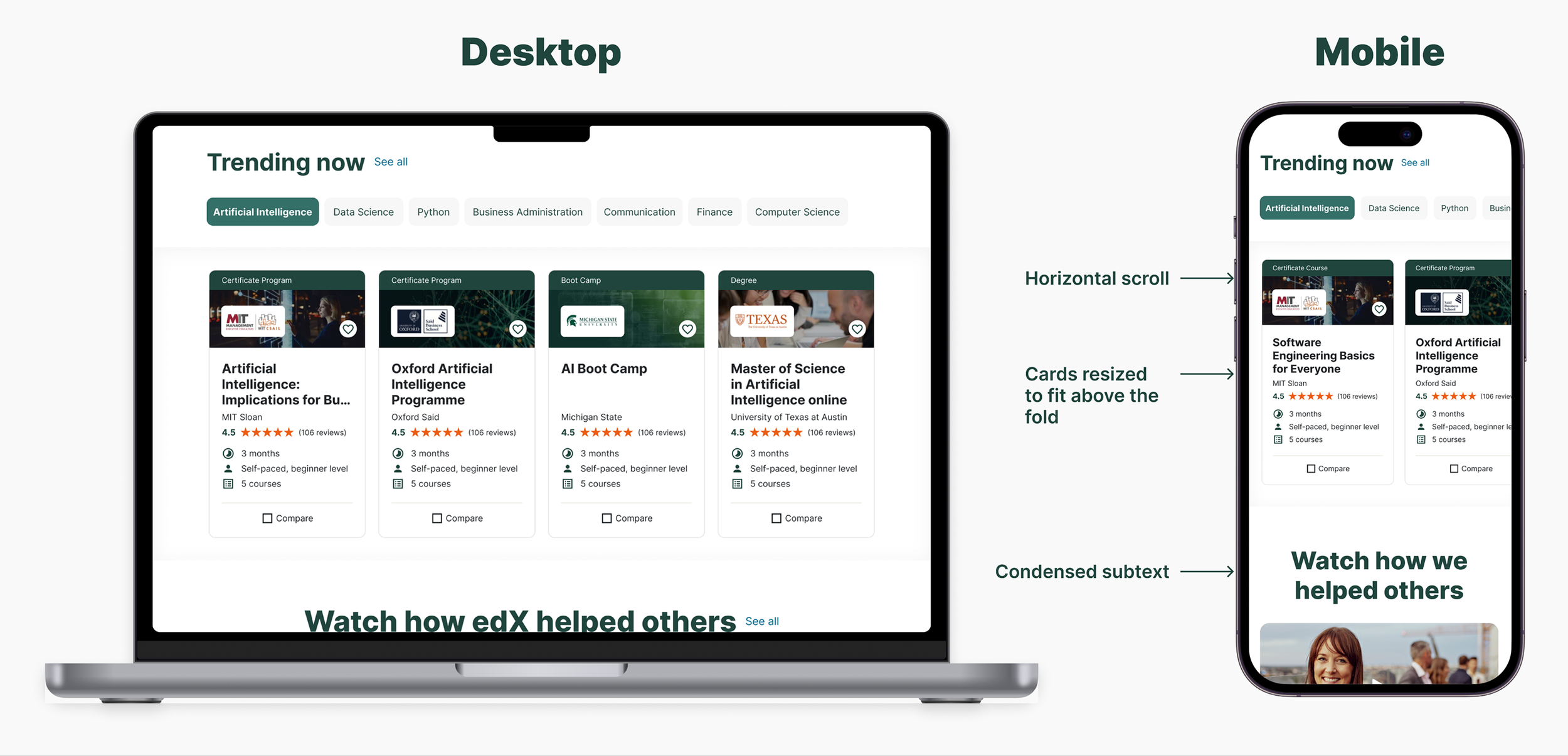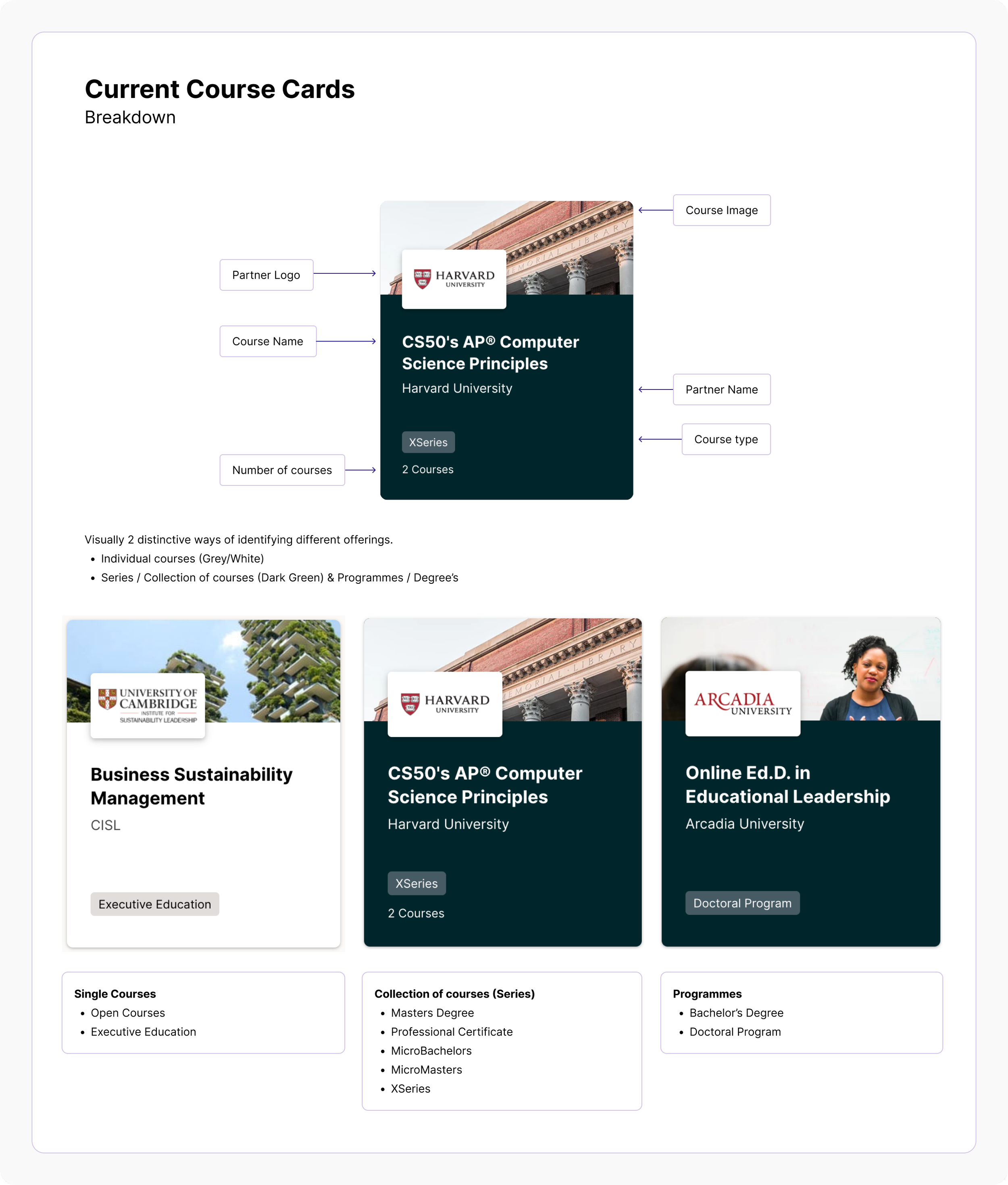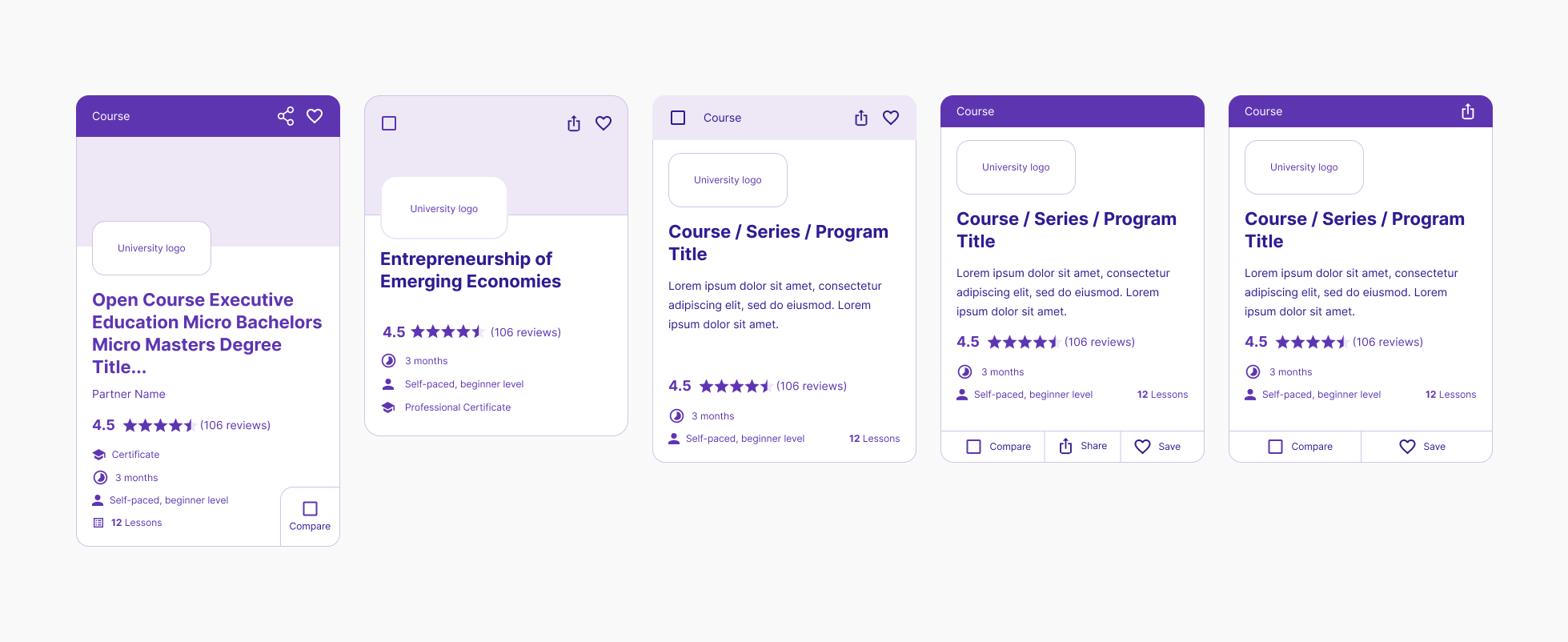 Design for extensibility. I focused on the Marketplace experience, but similar cards appear across other edX surfaces. With more time, I would’ve pushed for a shared card system to create consistency across the ecosystem.