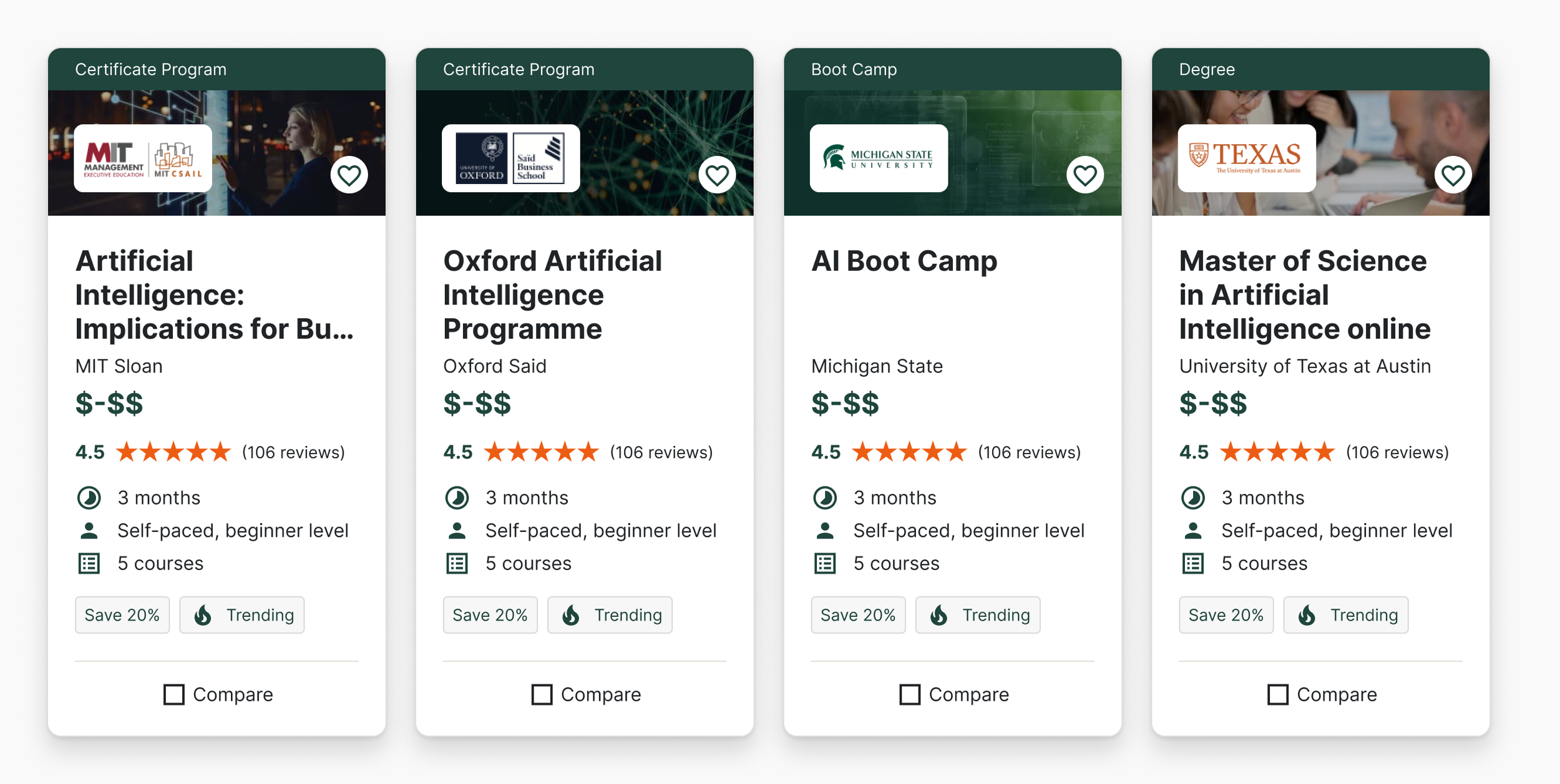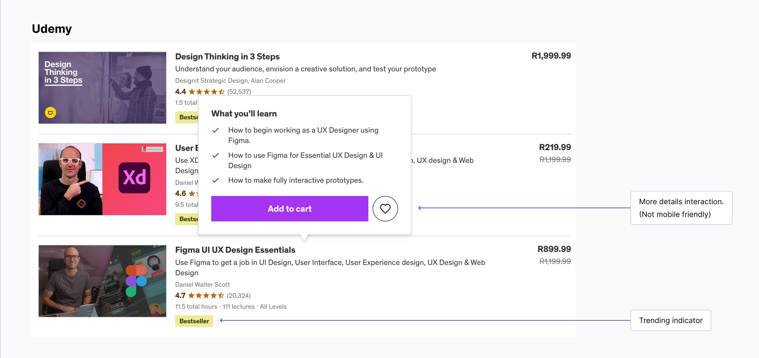 User research revealed a major usability issue: while our product cards looked clean, they lacked critical decision-making details such as course cost, length, level, and user ratings. This forced users to click into multiple course pages just to compare options.